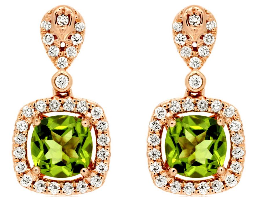 14KT ROSE GOLD HANGING EARRINGS. 3D SQUARE DESIGN. ROUND DIAMONDS ARE F/G COLOR, VSSI CLARITY .42 CARATS. AAA EXTRA FACETED CUSHION CUT PERIDOTS ARE 2.20 CARATS. WRITTEN APPRAISAL AVAILABLE. COMES IN A PRESENTABLE GIFT BOX.