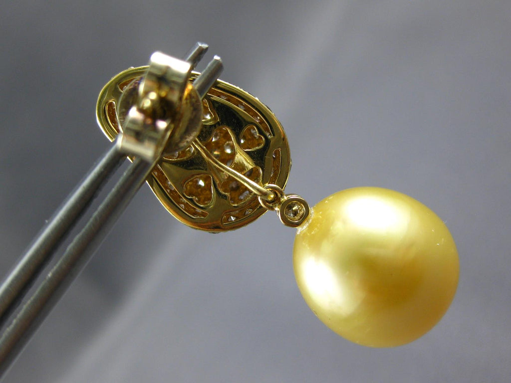 18KT YELLOW GOLD HANGING EARRINGS. 3D TEAR DROP CLASSIC DESIGN. CHOCOLATE FANCY DIAMONDS ARE 2.70 CARATS. FEATURES 12mm WIDE AAA GOLDEN SOUTH SEA PEARLS. EARRINGS MEASURE 31mm X 12mm. WRITTEN APPRAISAL AVAILABLE. COMES IN A PRESENTABLE GIFT BOX.