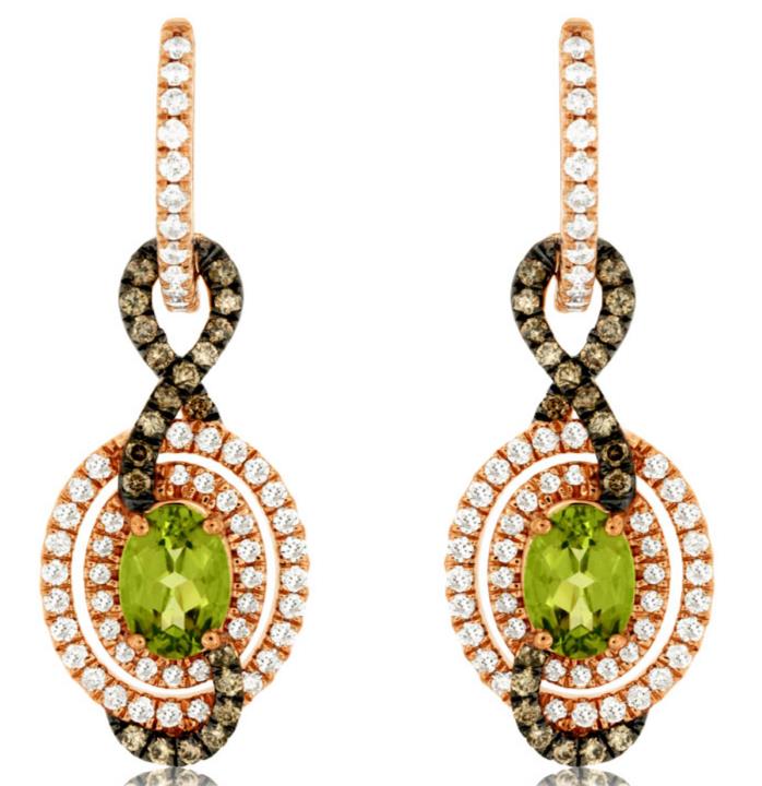 14KT ROSE GOLD LOVE HANGING EARRINGS. 3D DOUBLE HALO INFINITY DESIGN. ROUND DIAMONDS ARE F/G COLOR, VSSI CLARITY .72 CARATS. ROUND MOCHA DIAMONDS ARE .30 CARATS. AAA OVAL PERIDOTS ARE 1.70 CARATS. WRITTEN APPRAISAL AVAILABLE. COMES IN A PRESENTABLE GIFT BOX.