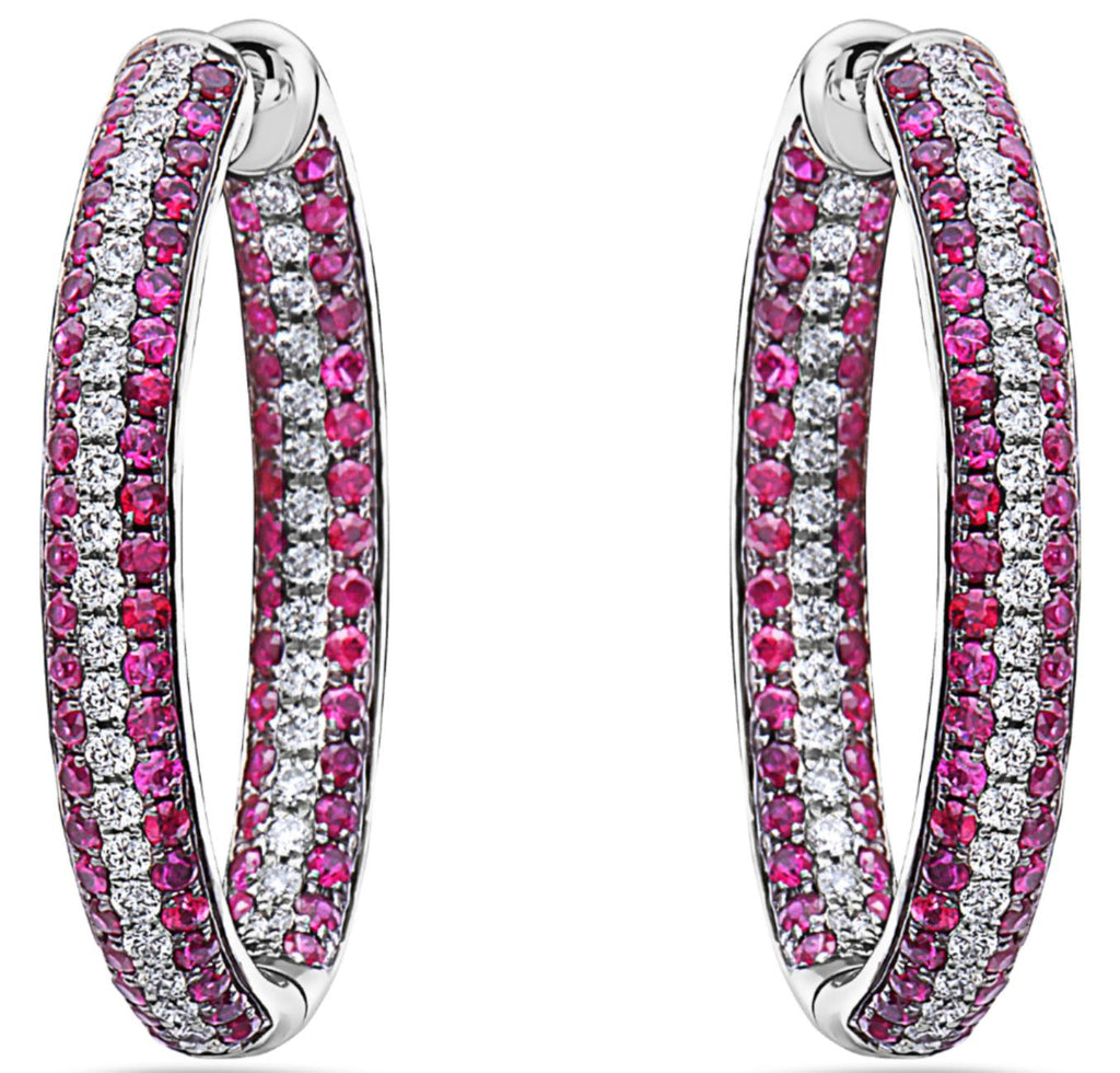 2.75CT DIAMOND & AAA RUBY 18KT WHITE GOLD 3 ROW INSIDE OUT HOOP HANGING EARRINGS