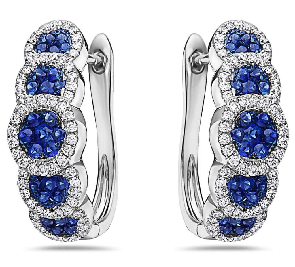 18KT WHITE GOLD LEVERBACK FUN HANGING EARRINGS. 3D MULTI CIRCULAR DESIGN. DIAMONDS ARE F/G COLOR, VSSI CLARITY .54 CARATS. AAA SAPPHIRES ARE 2.26 CARATS. WRITTEN APPRAISAL AVAILABLE. COMES IN A PRESENTABLE GIFT BOX.