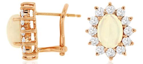 14KT ROSE GOLD CLIP ON EARRINGS. 3D CLASSIC FLOWER DESIGN. ROUND DIAMONDS ARE F/G COLOR, VSSI CLARITY 1.26 CARATS. AAA OVAL CABOCHON OPALS ARE 1.80 CARATS. WRITTEN APPRAISAL AVAILABLE. COMES IN A PRESENTABLE GIFT BOX.