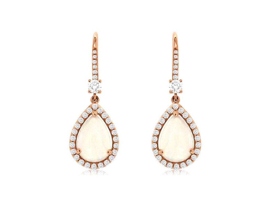 14KT ROSE GOLD LEVERBACK HANGING EARRINGS. 3D HALO DESIGN. ROUND DIAMONDS ARE F/G COLOR, VSSI CLARITY .66 CARATS. AAA PEAR SHAPE OPALS ARE 2.40 CARATS. WRITTEN APPRAISAL AVAILABLE. COMES IN A PRESENTABLE GIFT BOX.