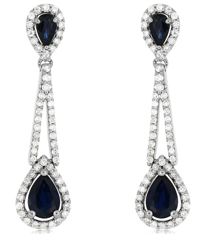 14KT WHITE GOLD HANGING EARRINGS. 3D TEAR DROP DESIGN. ROUND DIAMONDS ARE F/G COLOR, VSSI CLARITY .66 CARATS. AAA PEAR SHAPE SAPPHIRES ARE 2.40 CARATS. WRITTEN APPRAISAL AVAILABLE. COMES IN A PRESENTABLE GIFT BOX.