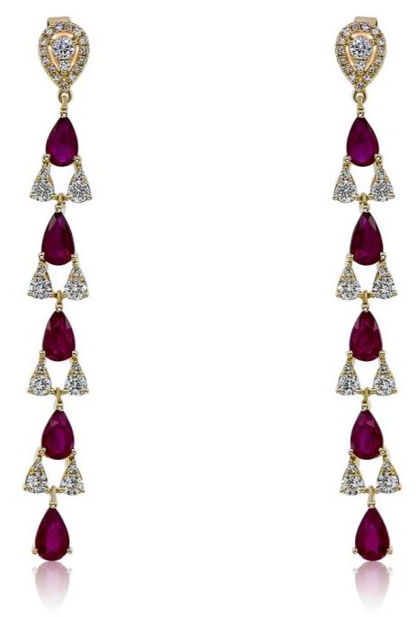 14KT YELLOW GOLD HANGING EARRINGS. 3D TRIANGULAR JOURNEY CHANDELIER DESIGN. DIAMONDS ARE F/G COLOR, VSSI CLARITY .65 CARATS. AAA RUBIES ARE 2.42 CARATS. WRITTEN APPRAISAL AVAILABLE. COMES IN A PRESENTABLE GIFT BOX.