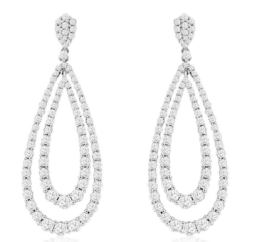14KT WHITE GOLD HANGING EARRINGS. 3D CLASSIC DOUBLE TEAR DROP CHANDELIER DESIGN. ROUND DIAMONDS ARE F/G COLOR, VSSI CLARITY 3.10 CARATS. WRITTEN APPRAISAL AVAILABLE. COMES IN A PRESENTABLE GIFT BOX.