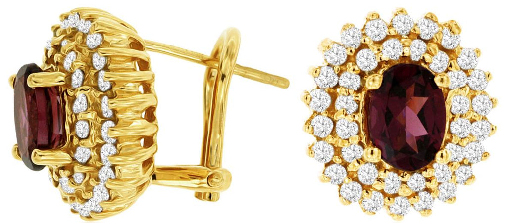 14KT YELLOWGOLD CLIP ONEARRINGS. 3D DOUBLE HALO FLOWERDESIGN. ROUND DIAMONDS ARE F/G COLOR, VSSI CLARITY 1.14 CARATS. AAA OVAL RHODOLITESARE 2.00CARATS. WRITTEN APPRAISAL AVAILABLE. COMES IN A PRESENTABLE GIFT BOX.