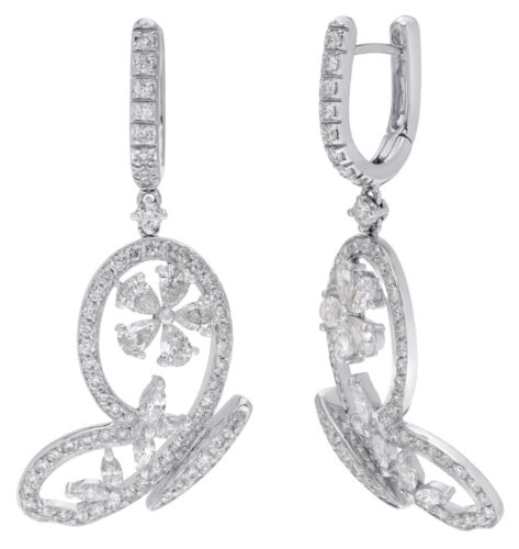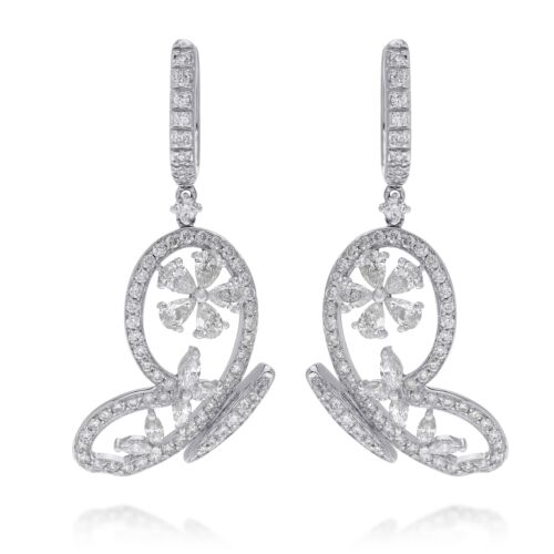 18KT WHITE GOLD HANGING EARRINGS. 3D BUTTERFLY FLOWER DESIGN. ROUND AND PEAR SHAPE DIAMONDS ARE F/G COLOR, VSSI CLARITY 3.19 CARATS. WRITTEN APPRAISAL AVAILABLE. COMES IN A PRESENTABLE GIFT BOX.