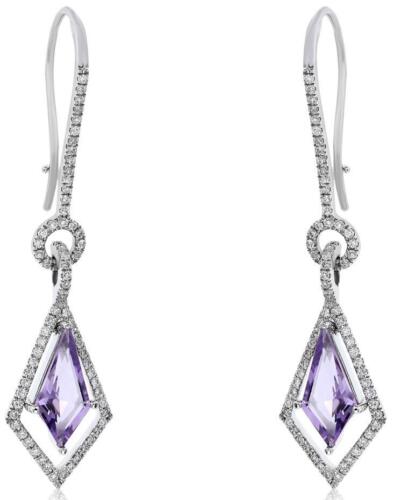 14KT WHITE GOLD LEVERBACK HANGING EARRINGS. 3D GEOMETRICAL LOVE KNOT DESIGN. DIAMONDS ARE F/G COLOR, VSSI CLARITY .55 CARATS. AAA AMETHYSTS ARE 2.67 CARATS. WRITTEN APPRAISAL AVAILABLE. COMES IN A PRESENTABLE GIFT BOX.