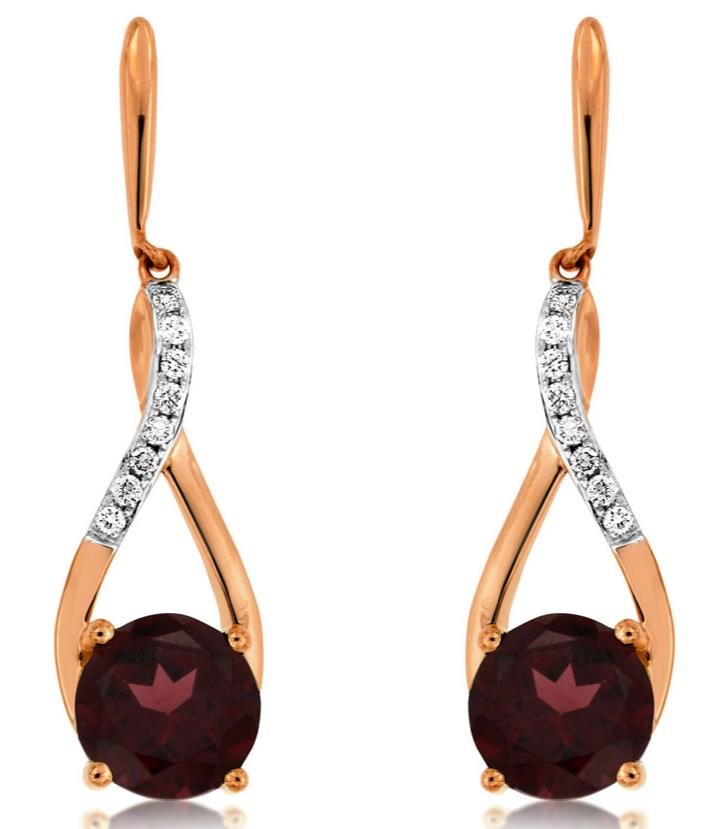 14KT WHITE GOLD HANGING EARRINGS. 3D INFINTY TEAR DROP DESIGN. DIAMONDS ARE F/G COLOR, VSSI CLARITY .10 CARATS. AAA RHODOLITES ARE 3.0 CARATS. WRITTEN APPRAISAL AVAILABLE. COMES IN A PRESENTABLE GIFT BOX.