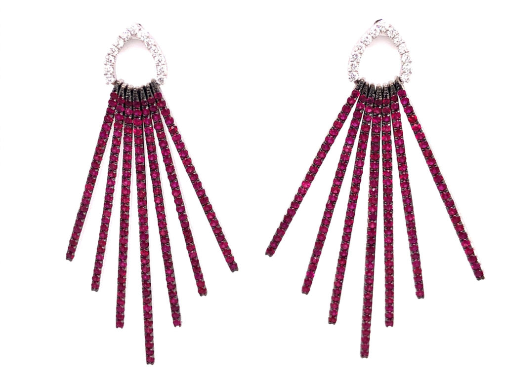 18KT WHITE GOLD HANGING EARRINGS. 3D CIRCULAR MULTI BAR DESIGN. DIAMONDS ARE F/G COLOR, VSSI CLARITY .34 CARATS. AAA RUBIES ARE 2.80 CARATS. WRITTEN APPRAISAL AVAILABLE. COMES IN A PRESENTABLE GIFT BOX.