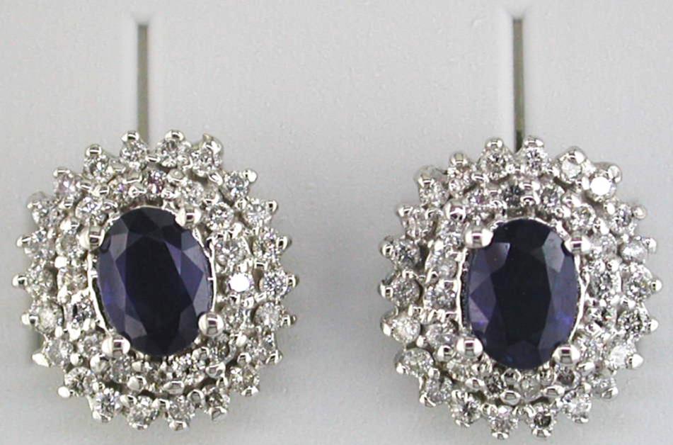 14KT WHITE GOLD STUD EARRINGS. 3D CLASSIC FLOWER DESIGN. ROUND DIAMONDS ARE F/G COLOR, VSSI CLARITY 1.14 CARATS. AAA OVAL SAPPHIRE ARE 2.0 CARATS. WRITTEN APPRAISAL AVAILABLE. COMES IN A PRESENTABLE GIFT BOX.