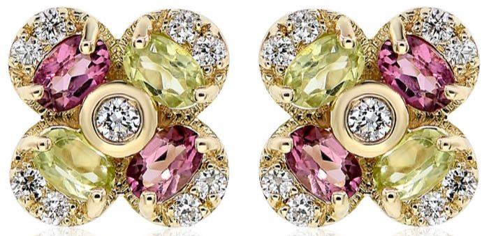 14KT YELLOW GOLD STUD EARRINGS. 3D FOUR LEAF CLOVER DESIGN. DIAMONDS ARE F/G COLOR, VSSI CLARITY .12 CARATS. AAA OVAL PERIDOTS AND TOURMALINES ARE .51 CARATS. WRITTEN APPRAISAL AVAILABLE. COMES IN A PRESENTABLE GIFT BOX.