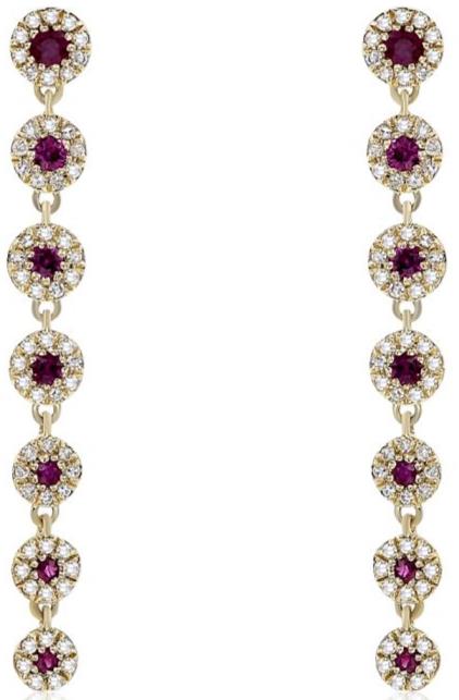 .74CT DIAMOND & AAA RUBY 14KT YELLOW GOLD MULTI FLOWER JOURNEY HANGING EARRINGS