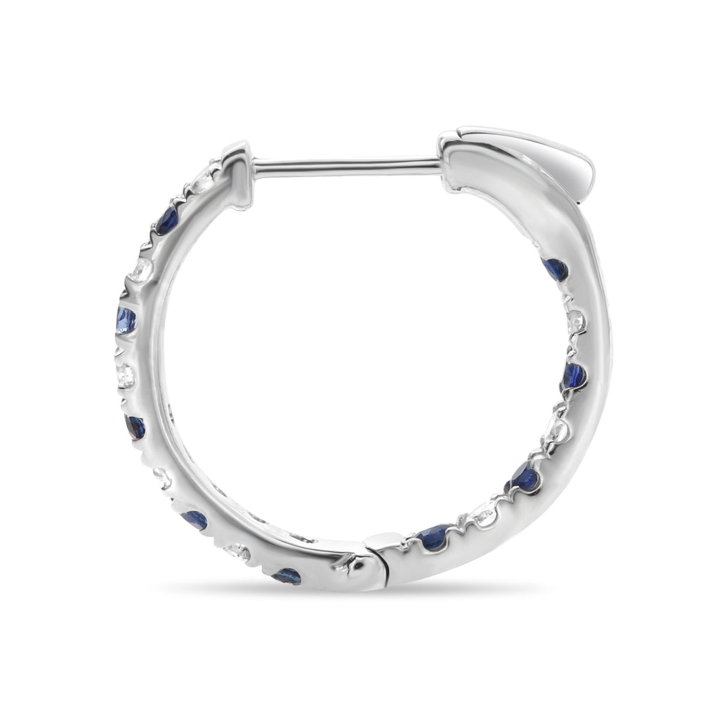 14KT WHITE GOLD HOOP HANGING EARRINGS. 3D INSIDE OUT CLASSIC DESIGN. ROUND DIAMONDS ARE F/G COLOR, VSSI CLARITY .25 CARATS. AAA SAPPHIRES ARE .39 CARATS. MEASURES .50MM. WRITTEN APPRAISAL AVAILABLE. COMES IN A PRESENTABLE GIFT BOX.