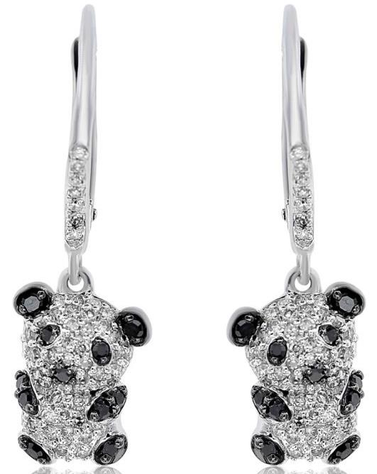 14KT WHITE GOLDHANGINGEARRINGS. 3D CLASSIC HAPPY TEDDY BEARDESIGN. WHITE DIAMONDS ARE F/G COLOR, VSSI CLARITY .38 CARATS. BLACK DIAMONDS ARE .15 CARATS.WRITTEN APPRAISAL AVAILABLE. COMES IN A PRESENTABLE GIFT BOX.