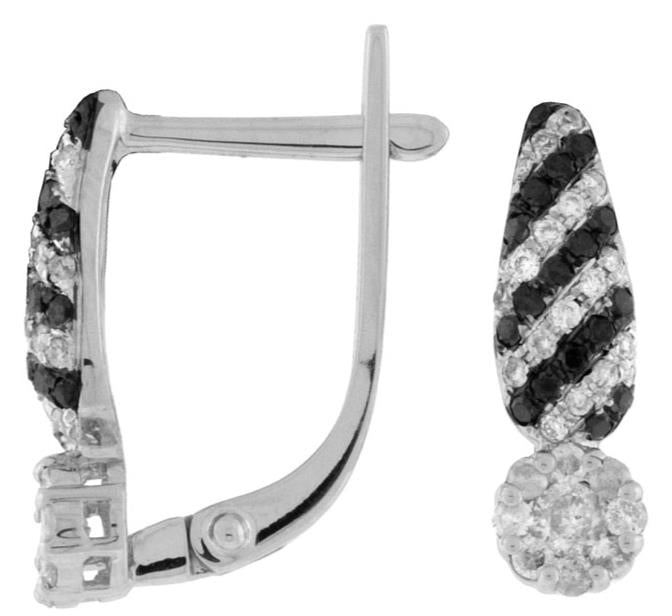 14KT WHITE GOLD LEVERBACK HANGING EARRINGS. 3D FLOWER DESIGN. WHITE DIAMONDS ARE F/G COLOR, VSSI CLARITY .38 CARATS. BLACK DIAMONDS ARE .18 CARATS. WRITTEN APPRAISAL AVAILABLE. COMES IN A PRESENTABLE GIFT BOX.