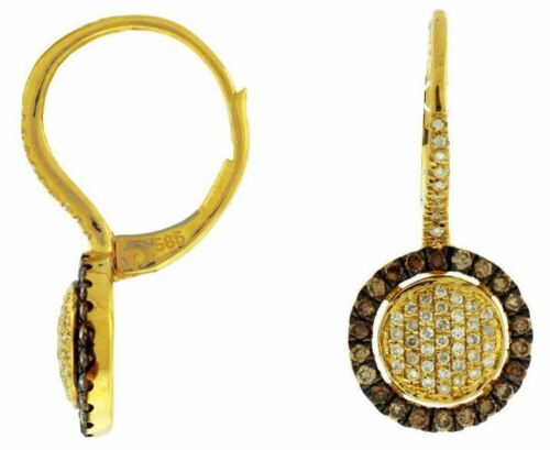 14KT YELLOW GOLD LEVERBACK HANGING EARRINGS. 3D CLUSTER ROUND FLOWER HALO DESIGN. WHITE DIAMONDS ARE F/G COLOR, VSSI CLARITY .20 CARATS. MOCHA DIAMONDS ARE .36 CARATS. WRITTEN APPRAISAL AVAILABLE. COMES IN A PRESENTABLE GIFT BOX.