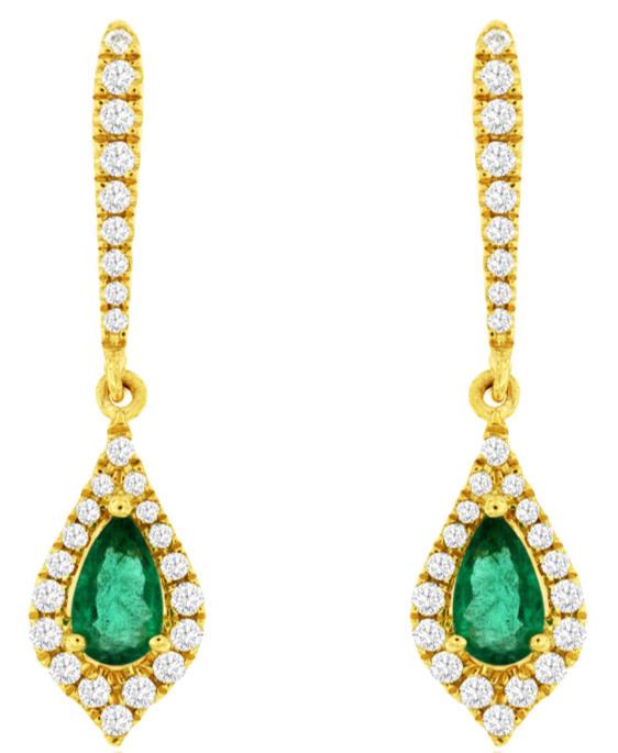 14KT YELLOW GOLD HANGING EARRINGS. 3D CLASSIC TEAR DROP DESIGN. ROUND DIAMONDS ARE F/G COLOR, VSSI CLARITY .22 CARATS. AAA PEAR SHAPE EMERALDS ARE .35 CARATS. WRITTEN APPRAISAL AVAILABLE. COMES IN A PRESENTABLE GIFT BOX.