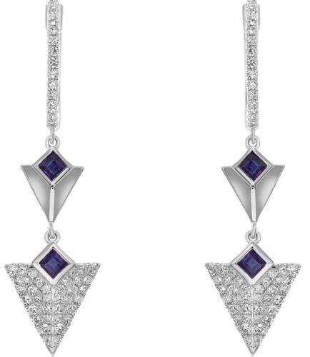 14KT WHITE GOLD HANGING EARRINGS. 3D TRIANGULAR DESIGN. ROUND DIAMONDS ARE F/G COLOR, VSSI CLARITY .32 CARATS. AAA PRINCESS CUT SAPPHIRES ARE .25 CARATS. WRITTEN APPRAISAL AVAILABLE. COMES IN A PRESENTABLE GIFT BOX.