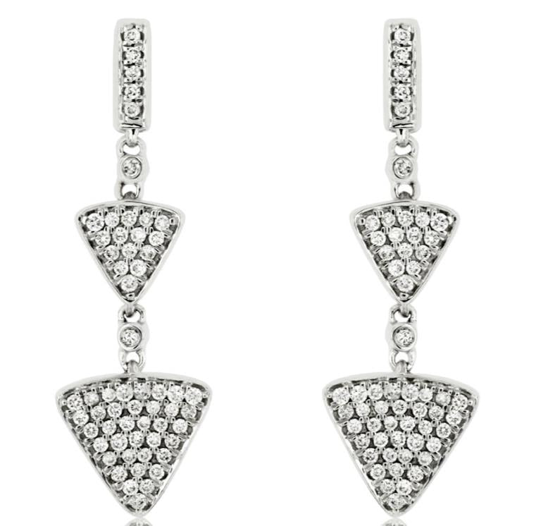 14KT WHITE GOLD HANGING EARRINGS. 3D CLASSIC CLUSTER TRILLION TRIANGULAR DESIGN. DIAMONDS ARE F/G COLOR, VSSI CLARITY .58 CARATS. WRITTEN APPRAISAL AVAILABLE. COMES IN A PRESENTABLE GIFT BOX.