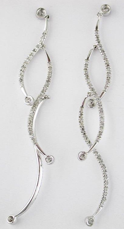 14KT WHITE GOLD FUN HANGING EARRINGS. 3D CRISS CROSS INFINITY MULTI LEAF DESIGN. DIAMONDS ARE F/G COLOR, VSSI CLARITY .58 CARATS. WRITTEN APPRAISAL AVAILABLE. COMES IN A PRESENTABLE GIFT BOX.
