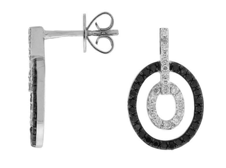 14KT WHITE GOLD HANGING EARRINGS. 3D DOUBLE OVAL CLASSICDESIGN. WHITEDIAMONDS ARE F/G COLOR, VSSI CLARITY .22 CARATS. BLACK DIAMONDS ARE .36 CARATS. WRITTEN APPRAISAL AVAILABLE. COMES IN A PRESENTABLE GIFT BOX.