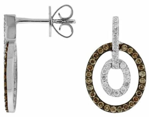 14KT WHITE GOLD HANGING EARRINGS. 3D DOUBLE HALO OVAL DESIGN. DIAMONDS ARE F/G COLOR, VSSI CLARITY .22 CARATS. CHOCOLATE FANCY DIAMONDS ARE .36 CARATS. WRITTEN APPRAISAL AVAILABLE. COMES IN A PRESENTABLE GIFT BOX.