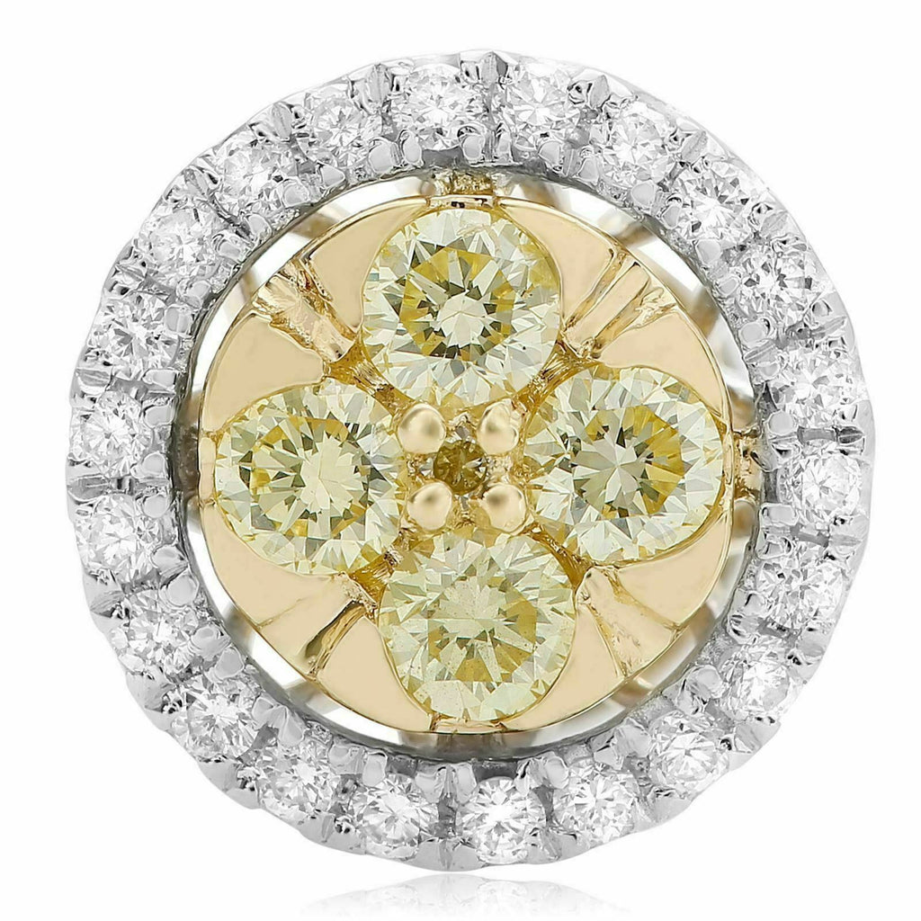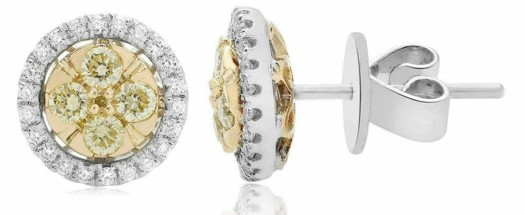 14KT WHITE AND YELLOW GOLD STUD EARRINGS. 3D CLUSTER ROUND CLASSIC DESIGN. DIAMONDS ARE F/G COLOR, VSSI CLARITY .20 CARATS. FANCY YELLOW DIAMONDS ARE .38 CARATS. MEASURES 9mm X 9mm. WRITTEN APPRAISAL AVAILABLE. COMES IN A PRESENTABLE GIFT BOX