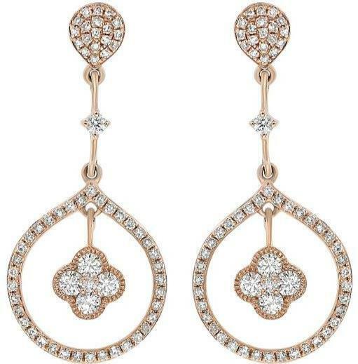 .59CT DIAMOND 14KT ROSE GOLD 3D 4 LEAF CLOVER FLOWER TEAR DROP HANGING EARRINGS