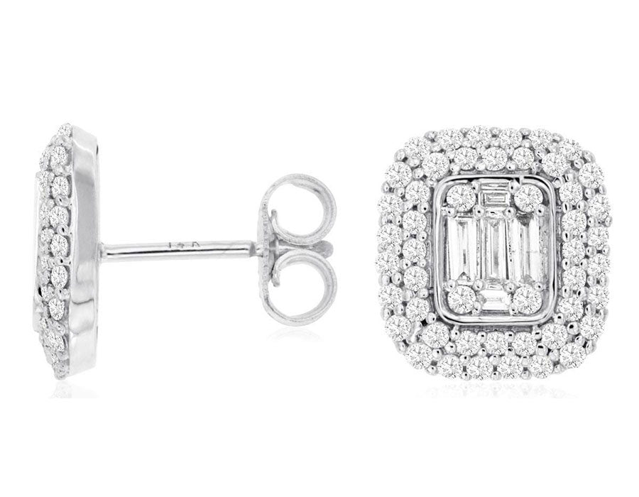 14KT WHITE GOLD STUD EARRINGS. 3D CLUSTER FLOWER SQUARE DESIGN. ROUND AND BAGUETTE DIAMONDS ARE F/G COLOR, VSSI CLARITY .59 CARATS. WRITTEN APPRAISAL AVAILABLE. COMES IN A PRESENTABLE GIFT BOX.