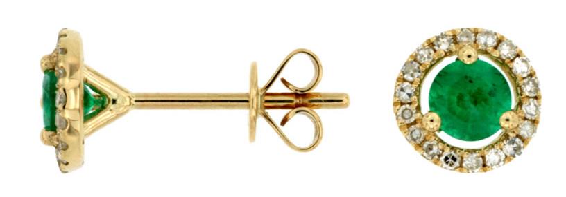 14KT YELLOW GOLD STUD EARRINGS. 3D ROUND HALO MARTINI DESIGN. DIAMONDS ARE F/G COLOR, VSSI CLARITY 0.15 CARATS. AAA ROUND EMERALDS ARE 0.70 CARATS. WRITTEN APPRAISAL AVAILABLE. COMES IN A PRESENTABLE GIFT BOX.