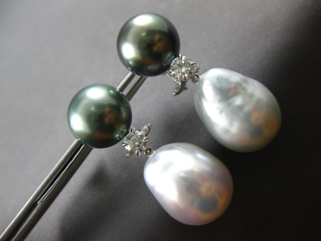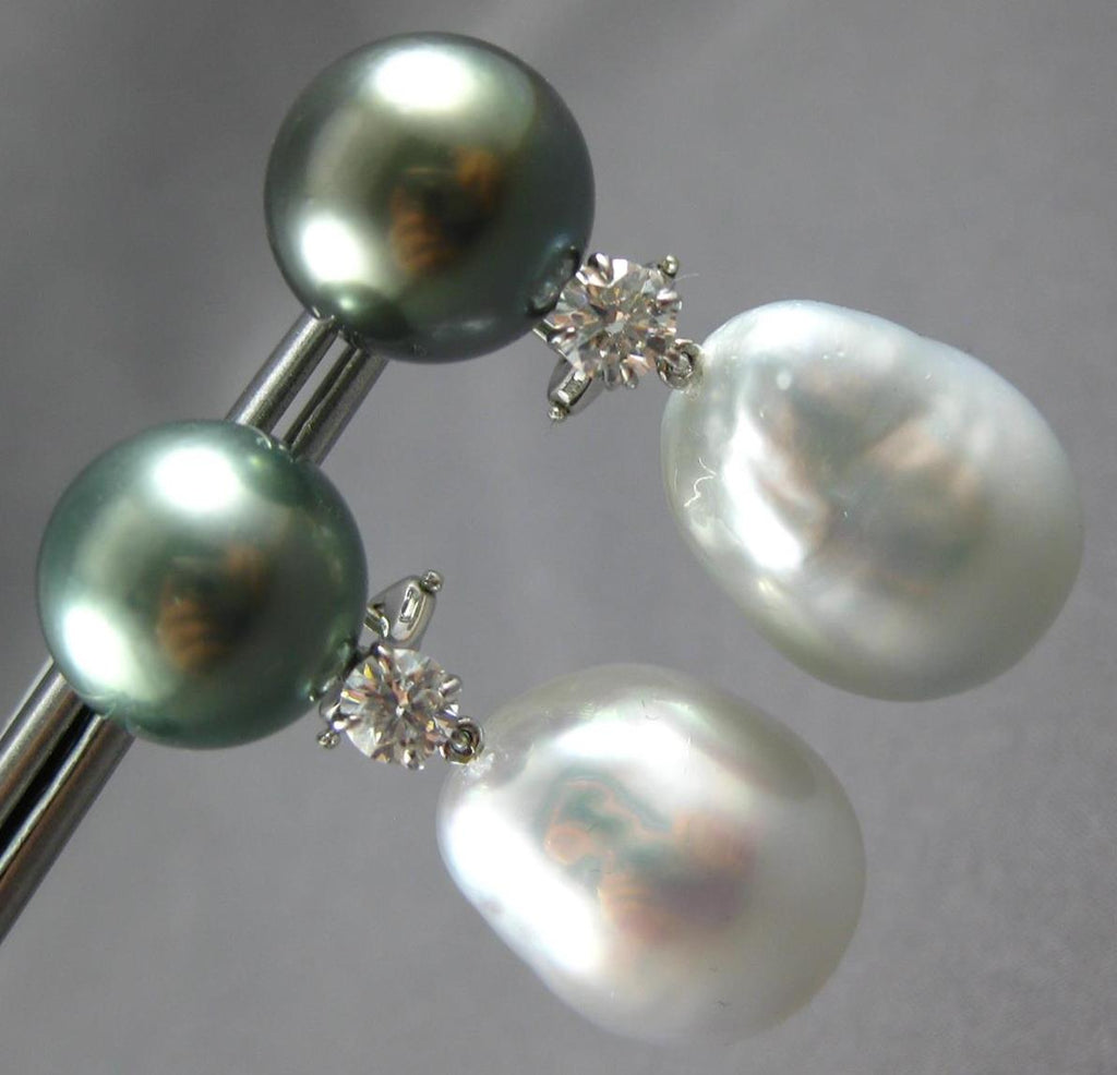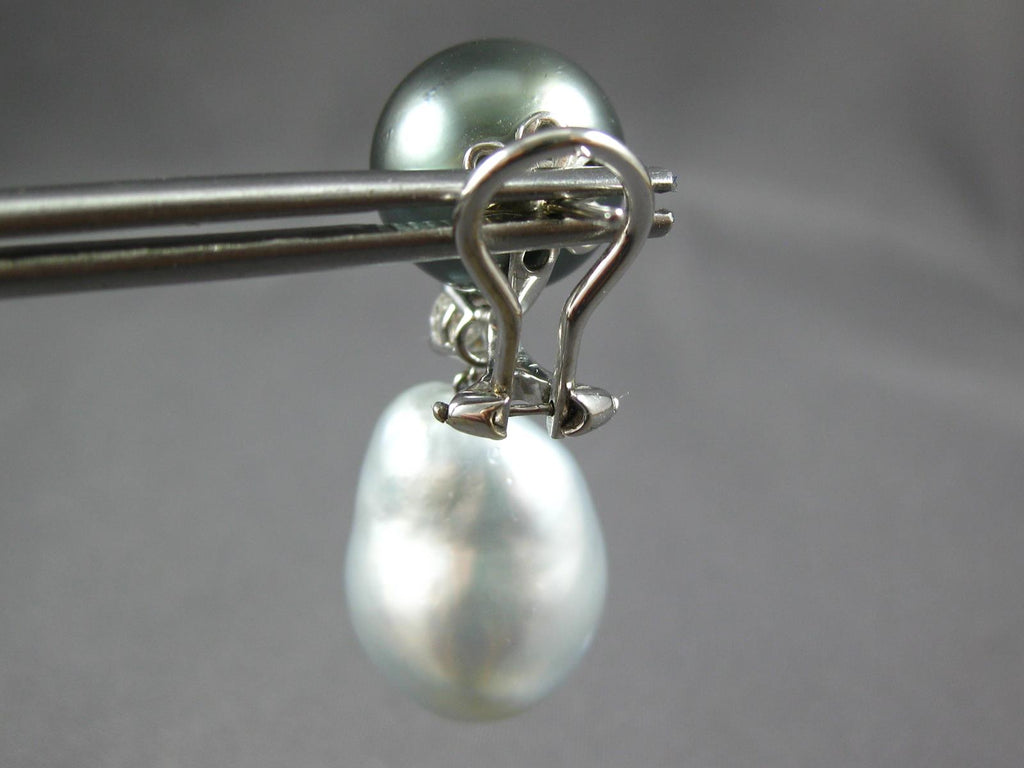 18KT WHITE GOLD CLIP ON HANGING EARRINGS. 3D CLASSIC DESIGN. DIAMONDS ARE F/G COLOR, VSSI CLARITY .60 CARATS. FEATURES 12.5mm WIDE AAA TAHITIAN PEARL. FEATURES 19mm X 14mm AAA SOUTH SEA PEARLS. EARRINGS MEASURE 37mm X 14mm. WRITTEN APPRAISAL AVAILABLE. COMES IN A PRESENTABLE GIFT BOX.