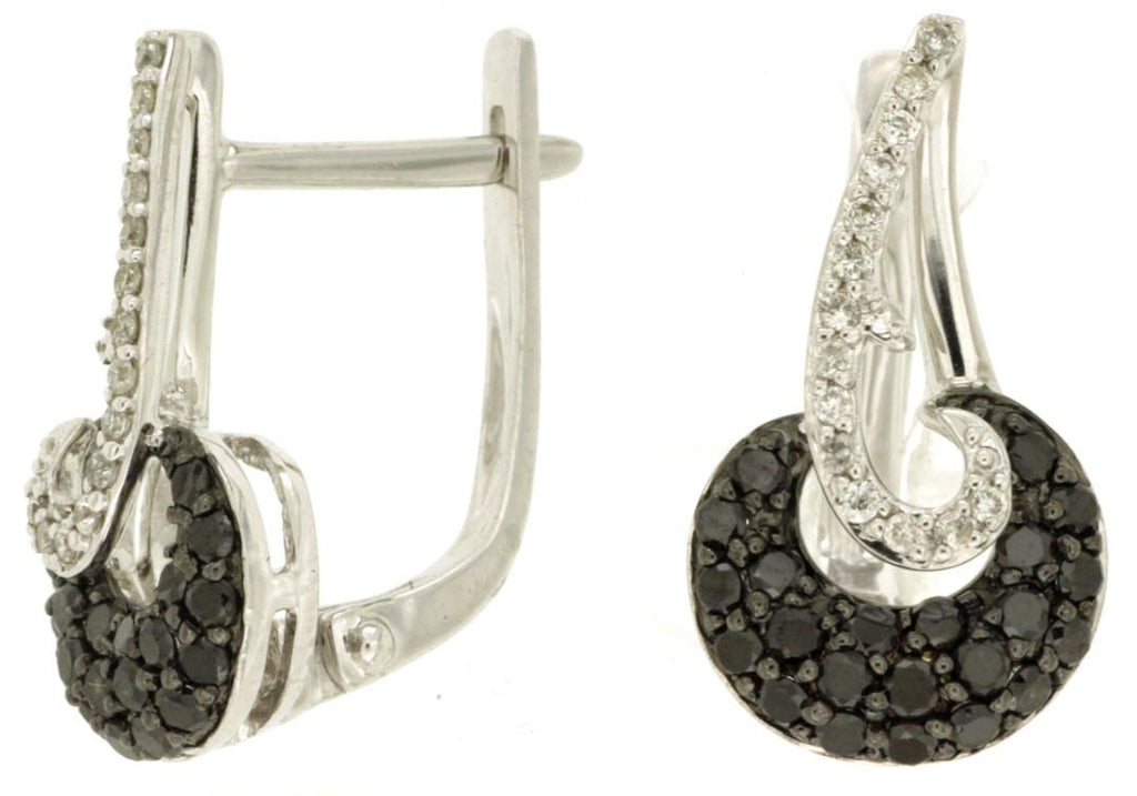 14KT WHITE GOLD LEVERBACK  HANGING  EARRINGS. 3D MOON  DESIGN. WHITE DIAMONDS ARE F/G COLOR, VSSI CLARITY .11 CARATS. BLACK  DIAMONDS ARE .50  CARATS.  WRITTEN APPRAISAL AVAILABLE. COMES IN A PRESENTABLE GIFT BOX.