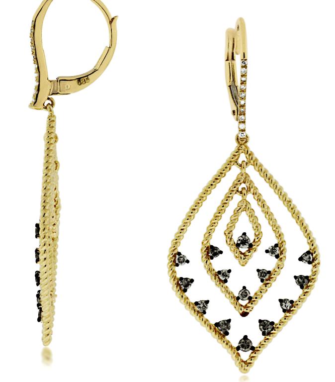 14KT YELLOW GOLD LEVERBACK HANGING EARRINGS. 3D ETOILE TEAR DROP DESIGN. WHITE DIAMONDS ARE F/G COLOR, VSSI CLARITY .06 CARATS. MOCHA DIAMONDS ARE .55 CARATS. WRITTEN APPRAISAL AVAILABLE. COMES IN A PRESENTABLE GIFT BOX.