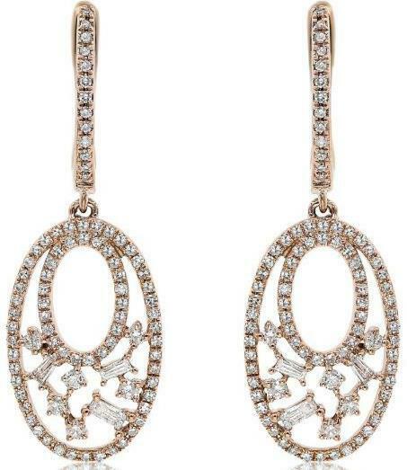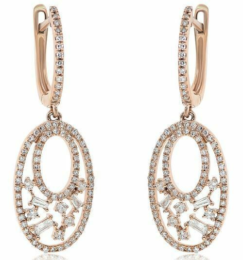 14KTROSE GOLD HANGINGEARRINGS. 3D OVAL OPEN FILIGREEDESIGN. ROUND AND BAGUETTE DIAMONDS ARE F/G COLOR, VSSI CLARITY.62CARATS.WRITTEN APPRAISAL AVAILABLE. COMES IN A PRESENTABLE GIFT BOX.