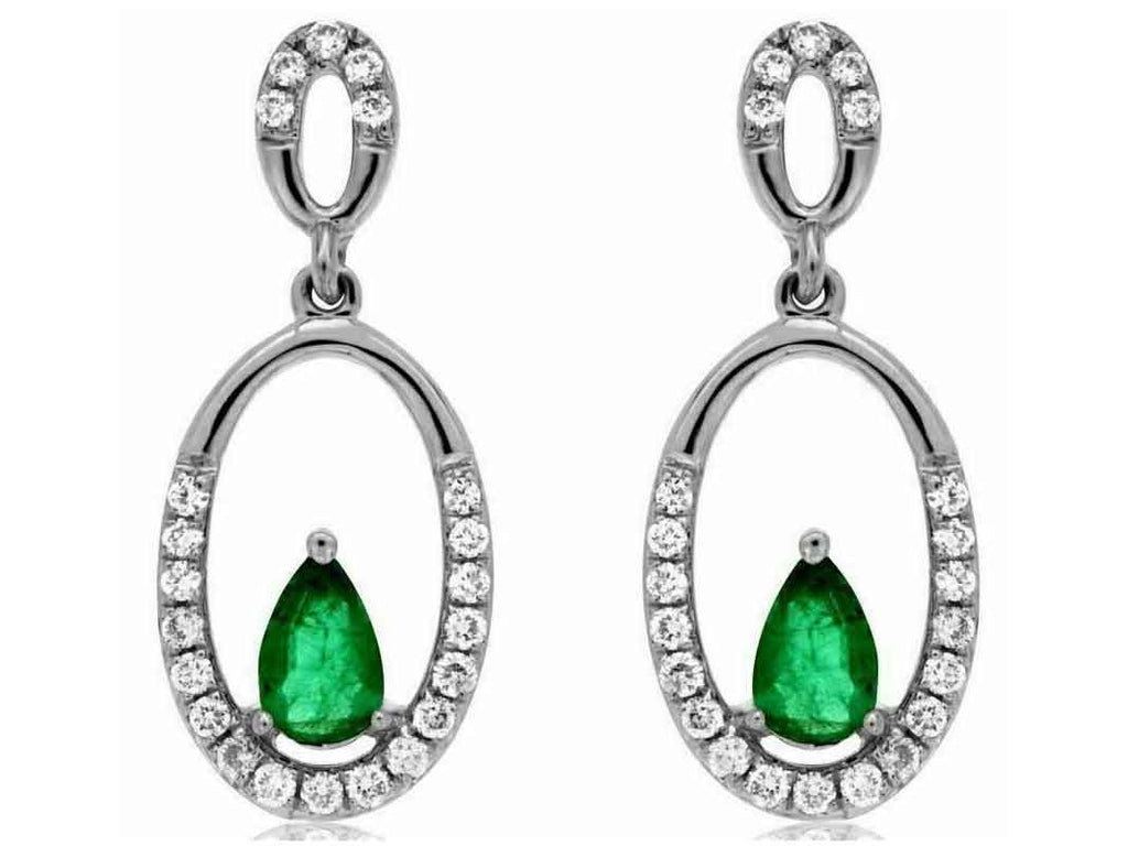 14KT WHITE GOLD HANGING EARRINGS. 3D CLASSIC TEAR DROP OVAL DESIGN. ROUND DIAMONDS ARE F/G COLOR, VSSI CLARITY .20 CARATS. AAA PEAR SHAPE EMERALDS ARE .42 CARATS. WRITTEN APPRAISAL AVAILABLE. COMES IN A PRESENTABLE GIFT BOX.