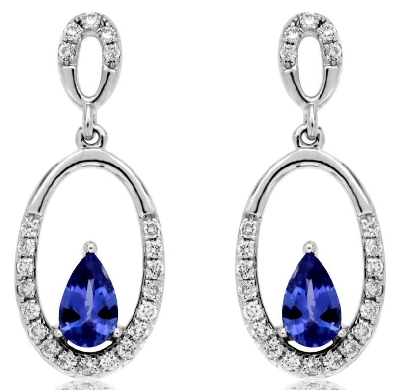 14KT WHITE GOLD HANGING EARRINGS. 3D DOUBLE OVALDESIGN. ROUND DIAMONDS ARE F/G COLOR, VSSI CLARITY 0.20 CARATS. AAA PEAR SHAPETANZANITES ARE 0.42 CARATS. WRITTEN APPRAISAL AVAILABLE. COMES IN A PRESENTABLE GIFT BOX.