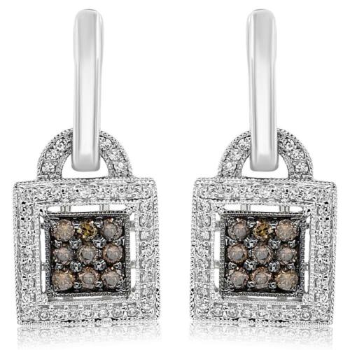 .62CT WHITE & MOCHA DIAMOND 14KT WHITE GOLD CLUSTER SQUARE LOCK HANGING EARRINGS