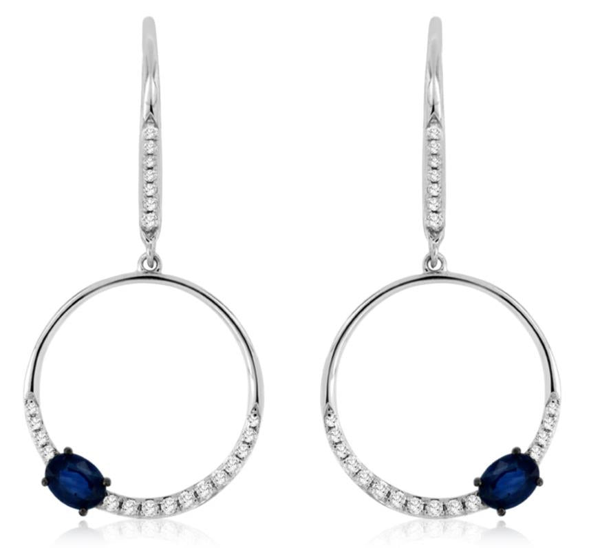 14KT WHITE GOLD LEVERBACK HANGING EARRINGS. 3D CIRCULAR DESIGN. ROUND DIAMONDS ARE F/G COLOR, VSSI CLARITY .18 CARATS. AAA OVAL SAPPHIRES ARE .45 CARATS. WRITTEN APPRAISAL AVAILABLE. COMES IN A PRESENTABLE GIFT BOX.