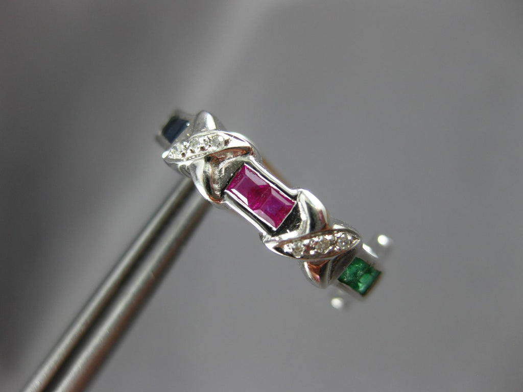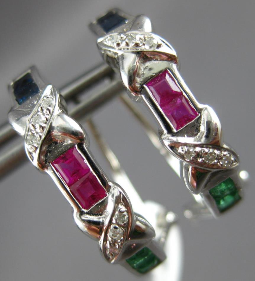 14KT WHITE GOLD CLIP ON HANGING EARRINGS. 3D X DESIGN. DIAMONDS ARE F/G COLOR, VSSI CLARITY .04 CARATS. AAA PRINCESS SAPPHIRES, EMERALDS AND RUBIES ARE .60 CARATS. MEASURES 18mm X 4mm. WRITTEN APPRAISAL AVAILABLE. COMES IN A PRESENTABLE GIFT BOX.