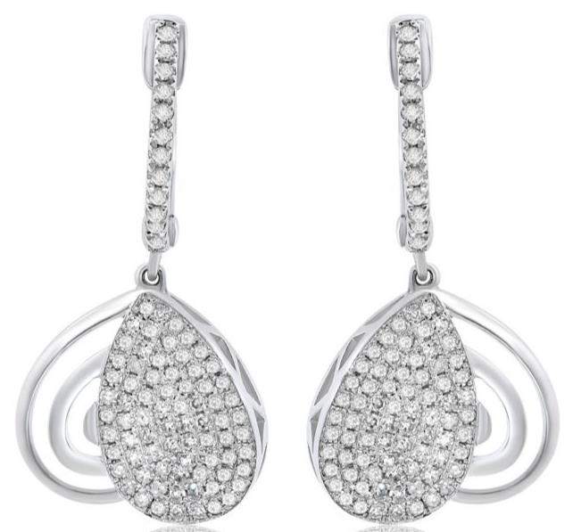 14KT WHITE GOLD HANGINGEARRINGS. 3D CLUSTER PEAR SHAPE TEAR DROPDESIGN. DIAMONDS ARE F/G COLOR, VSSI CLARITY .65 CARATS.WRITTEN APPRAISAL AVAILABLE. COMES IN A PRESENTABLE GIFT BOX.