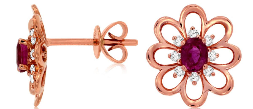 14KT ROSE GOLD STUD EARRINGS. 3D CLASSIC FLOWER DESIGN. ROUND DIAMONDS ARE F/G COLOR, VSSI CLARITY .15 CARATS. AAA OVAL RUBIES ARE .50 CARATS. WRITTEN APPRAISAL AVAILABLE. COMES IN A PRESENTABLE GIFT BOX.