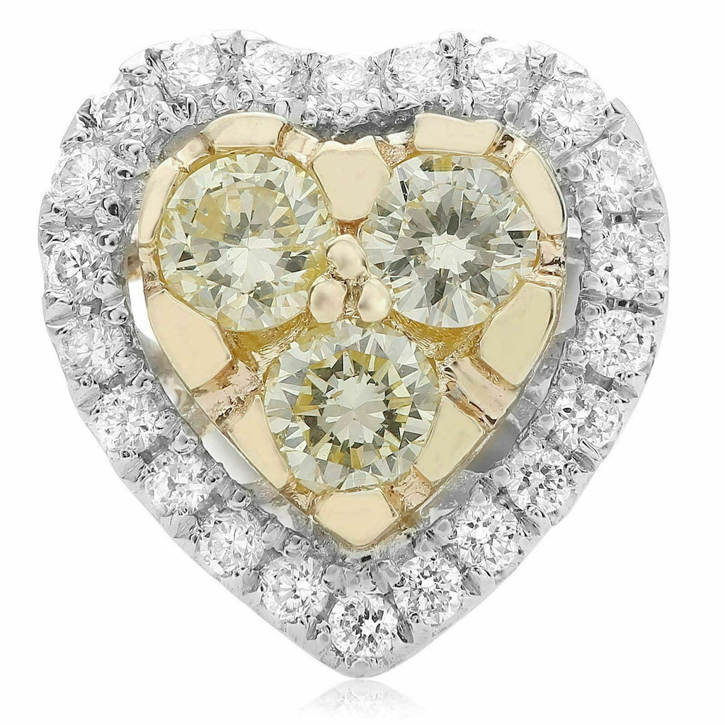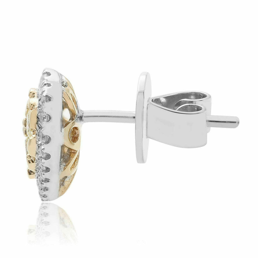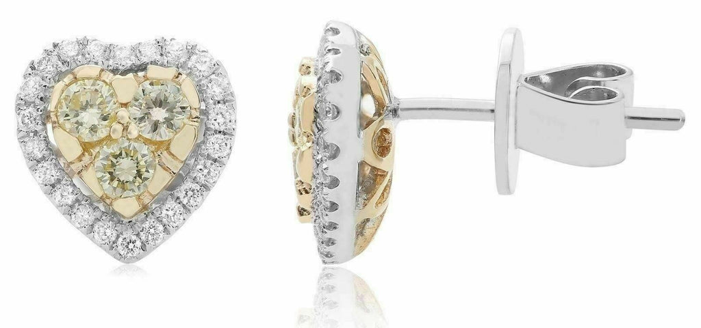 14KT WHITE AND YELLOW GOLD STUD EARRINGS. 3D CLUSTER HEART SHAPE CLASSIC DESIGN. DIAMONDS ARE F/G COLOR, VSSI CLARITY .20 CARATS. FANCY YELLOW DIAMONDS ARE .39 CARATS. MEASURES 9mm X 9mm. WRITTEN APPRAISAL AVAILABLE. COMES IN A PRESENTABLE GIFT BOX