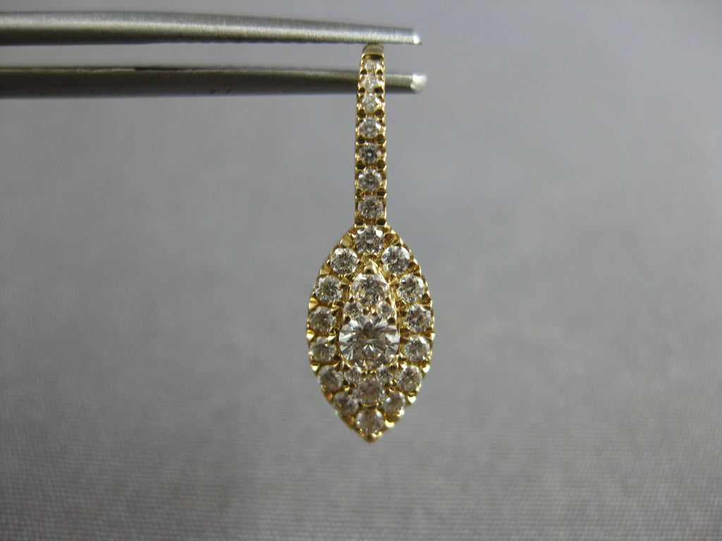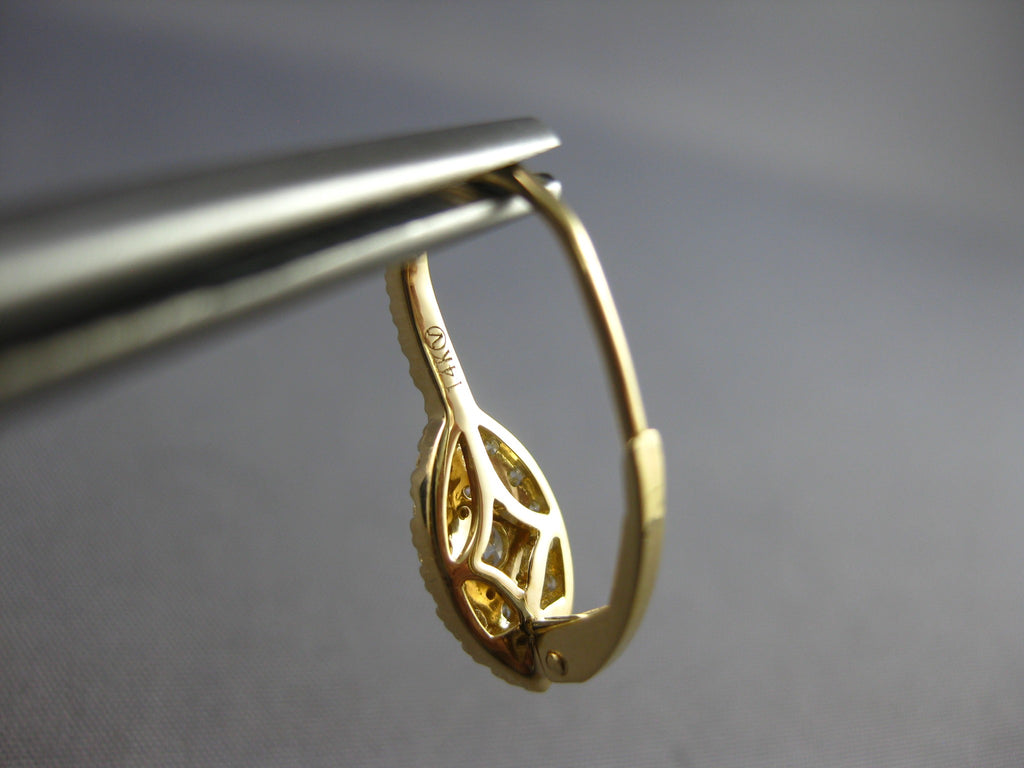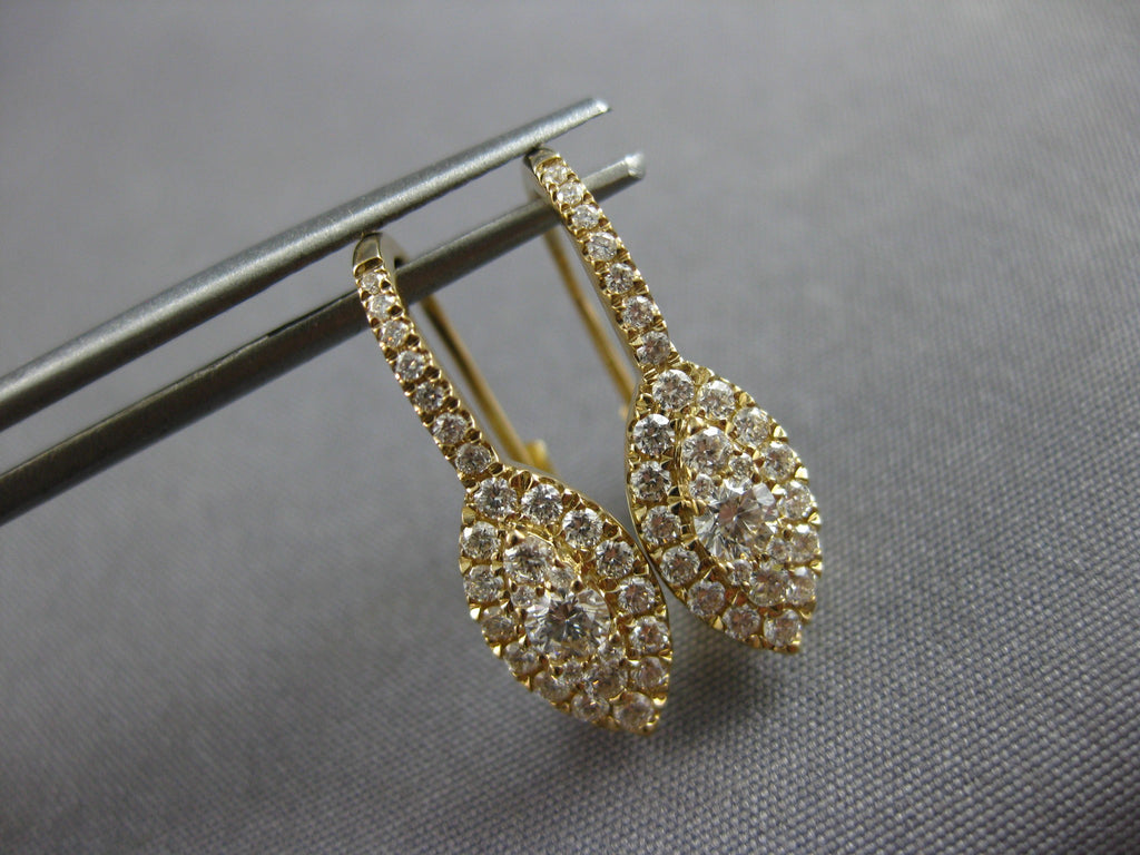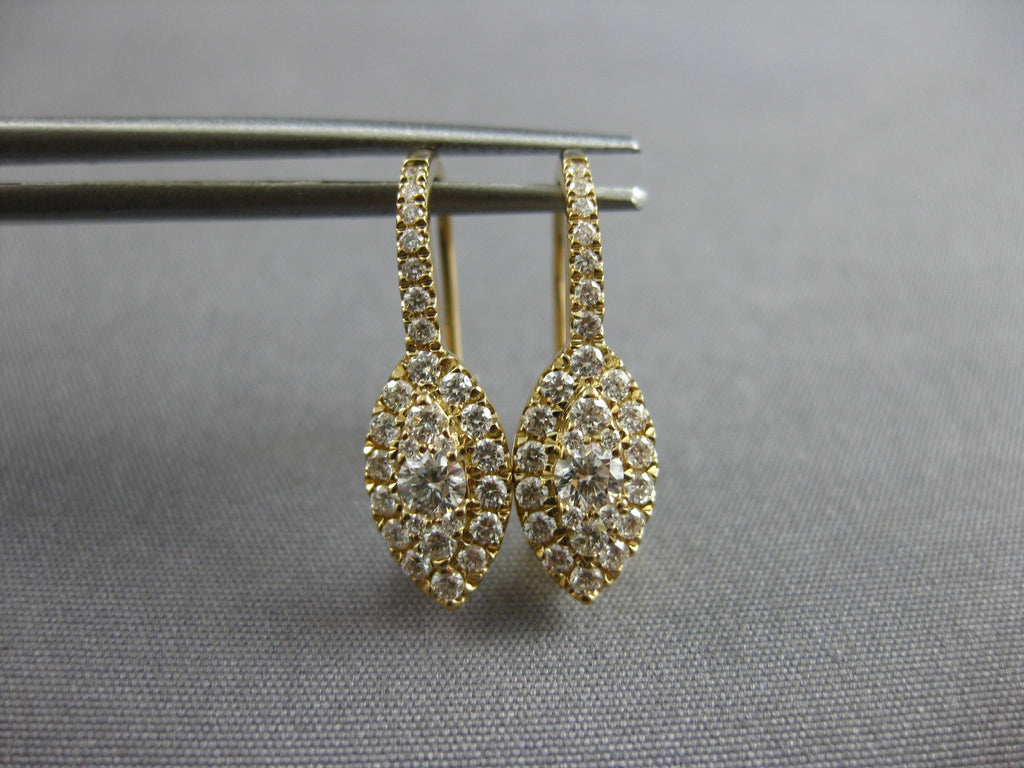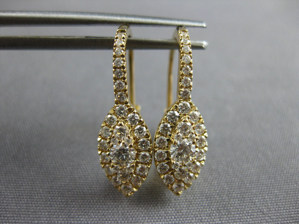 14KT YELLOW GOLD LEVERBACK HANGING EARRINGS. 3D MARQUISE SHAPE HALO DESIGN. DIAMONDS ARE F/G COLOR, VVS-VS CLARITY .66 CARATS. MEASURES 20mm X 6.3mm. WRITTEN APPRAISAL AVAILABLE. COMES IN A PRESENTABLE GIFT BOX.