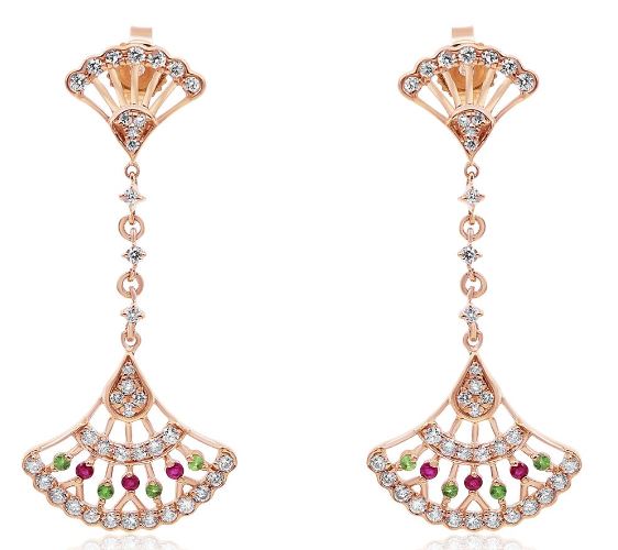 14KT ROSEGOLD FUN HANGINGEARRINGS. 3D FILIGREE BY THE YARDDESIGN. DIAMONDS ARE F/G COLOR, VSSI CLARITY .53CARATS. AAA RUBIES ARE .06 CARATS. AAA TSAVORITES ARE .07CARATS.WRITTEN APPRAISAL AVAILABLE. COMES IN A PRESENTABLE GIFT BOX.