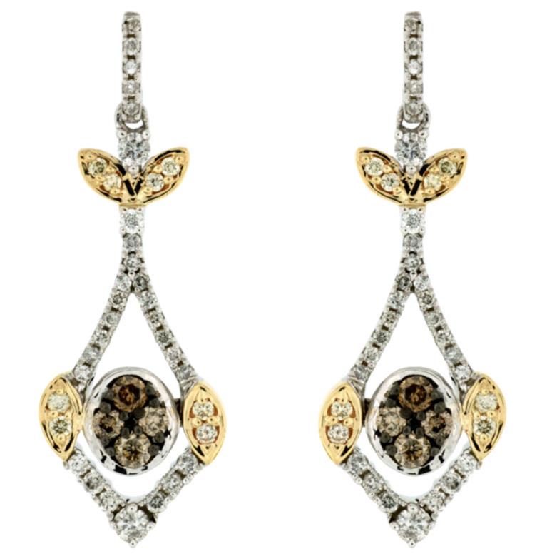 14KT WHITE GOLD HANGING EARRINGS. 3D FLOWER MULTI LEAF DESIGN. WHITE DIAMONDS ARE F/G COLOR, VSSI CLARITY .35 CARATS. MOCHA DIAMONDS ARE .21 CARATS. CANARY DIAMONDS ARE .10 CARATS. WRITTEN APPRAISAL AVAILABLE. COMES IN A PRESENTABLE GIFT BOX.
