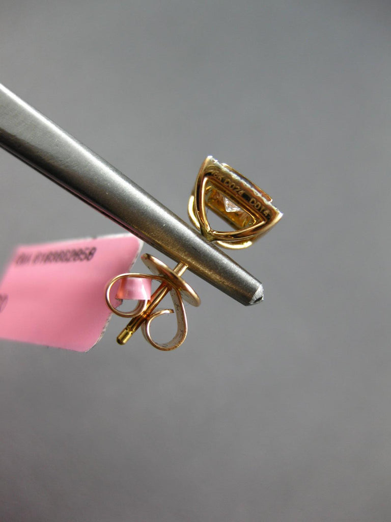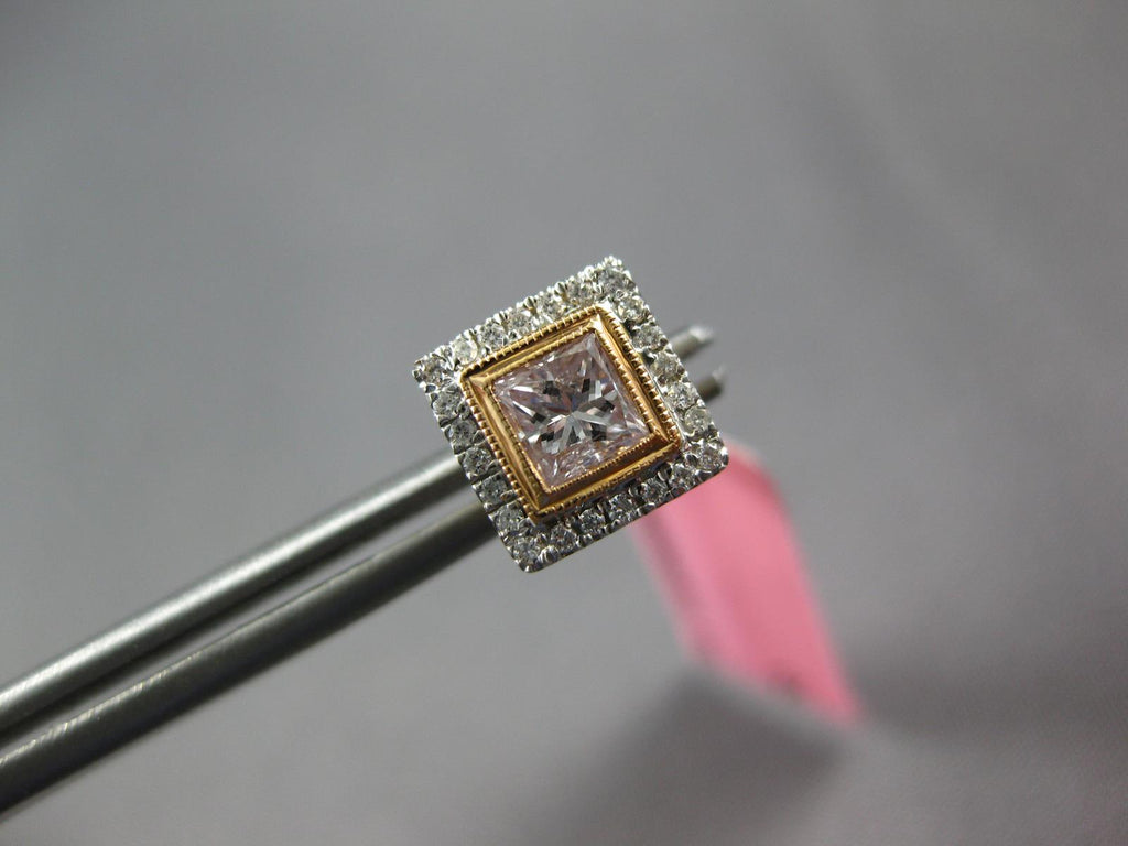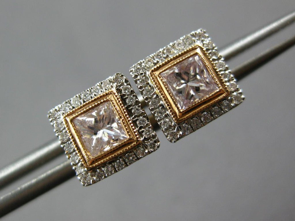 18KT ROSE GOLD STUD EARRINGS. 3D SQUARE HALO DESIGN. ROUND WHITE DIAMONDS ARE F/G COLOR, VS CLARITY .14 CARATS. PRINCESS CUT PINK DIAMONDS ARE .52 CARATS. MEASURES 7mm X 7mm. WRITTEN APPRAISAL AVAILABLE. COMES IN A PRESENTABLE GIFT BOX.