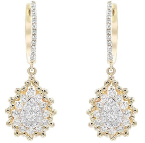.68CT DIAMOND 14KT 2 TONE GOLD ROUND CLUSTER TEAR DROP HUGGIE HANGING EARRINGS