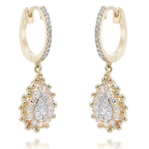 14KT WHITE AND YELLOW GOLD HUGGIE HANGING EARRINGS. 3D CLUSTER TEAR DROP DESIGN. ROUND DIAMONDS ARE F/G COLOR, VSSI CLARITY .68 CARATS. WRITTEN APPRAISAL AVAILABLE. COMES IN A PRESENTABLE GIFT BOX.